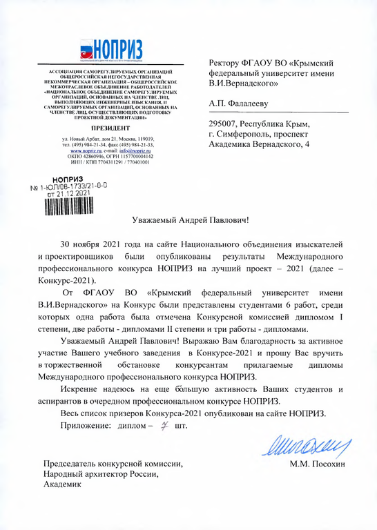 «Уважаемый Андрей Павлович! Выражаю Вам благодарность за активное участие Вашего учебного заведения в Конкурсе-2021! Искренне надеюсь на еще большую активность Ваших студентов и аспирантов в очередном профессиональном конкурсе НОПРИЗ», - говорится в благодарственном письме Президента НОПРИЗ, Народный архитектор России, Академика Михаила Посохина.