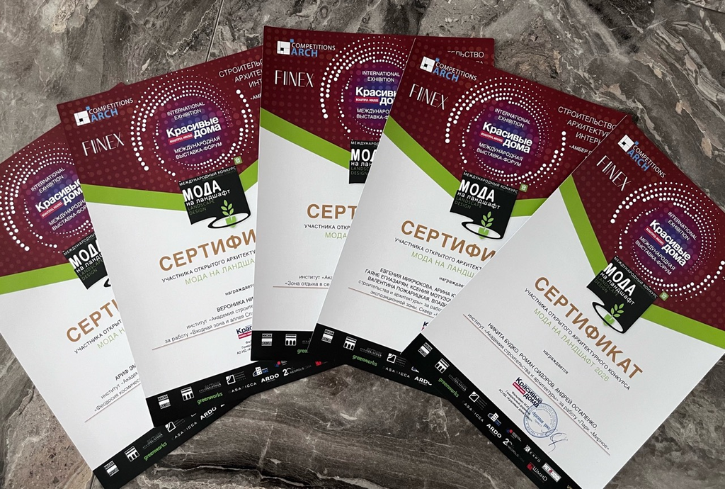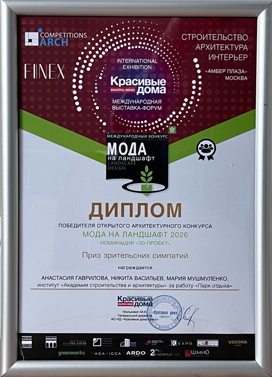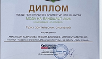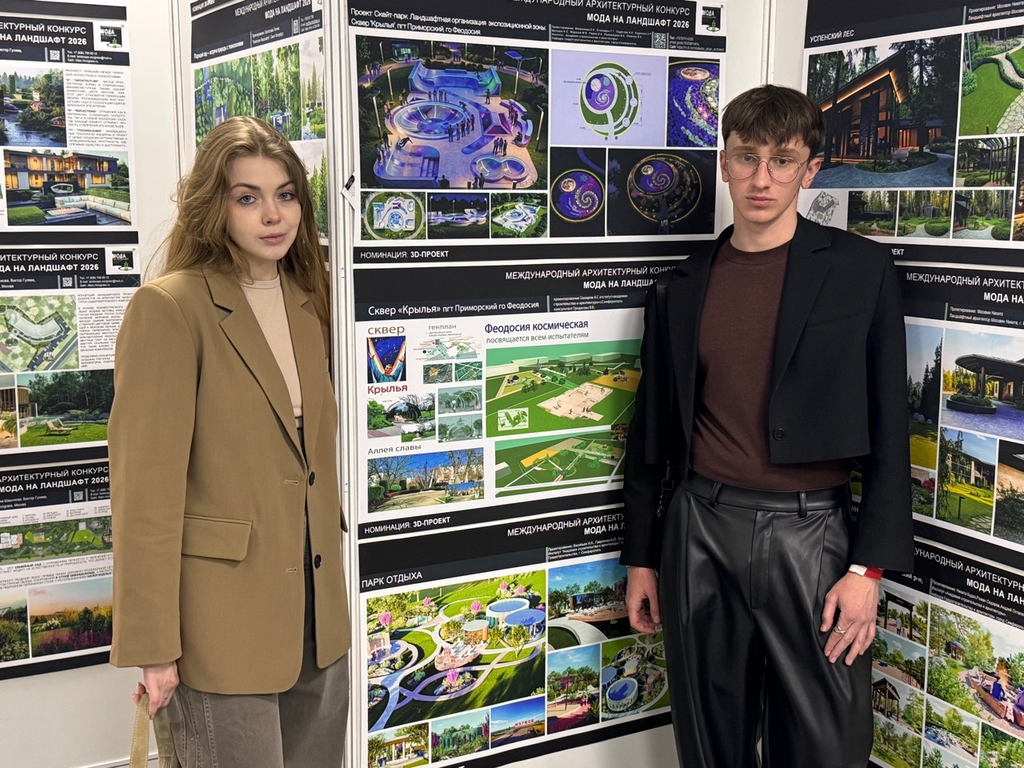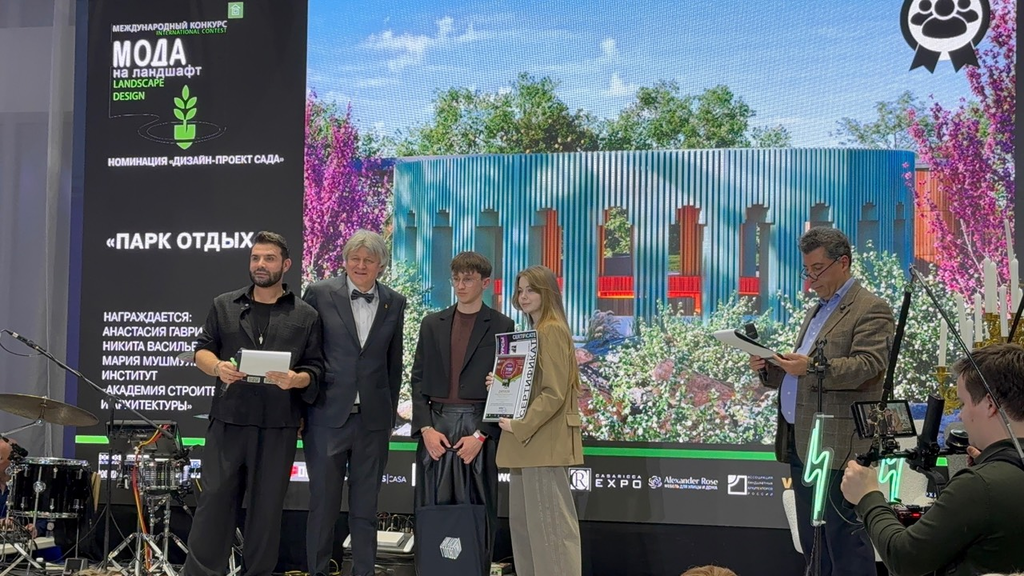 Студенты 4 курса кафедры Градостроительства и архитектуры: Васильев Никита, Гаврилова Анастасия, Мушмуленко Мария, стали победителями в номинации "Мода на ландшафт - приз зрительских симпатий" с проектом "Парк "Мирное", руководитель доцент кафедры Меметова Татьяна Дмитриевна.