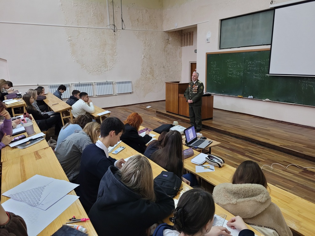 Евгений Александрович начал свою беседу с истории праздника, подчеркнув его глубокий смысл и историческое значение. Эпиграфом встречи стали бессмертные слова из песни «Вечный огонь» из кинофильма «Офицеры», которые задали тон всему разговору о мужестве и самоотверженности.