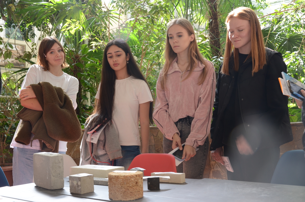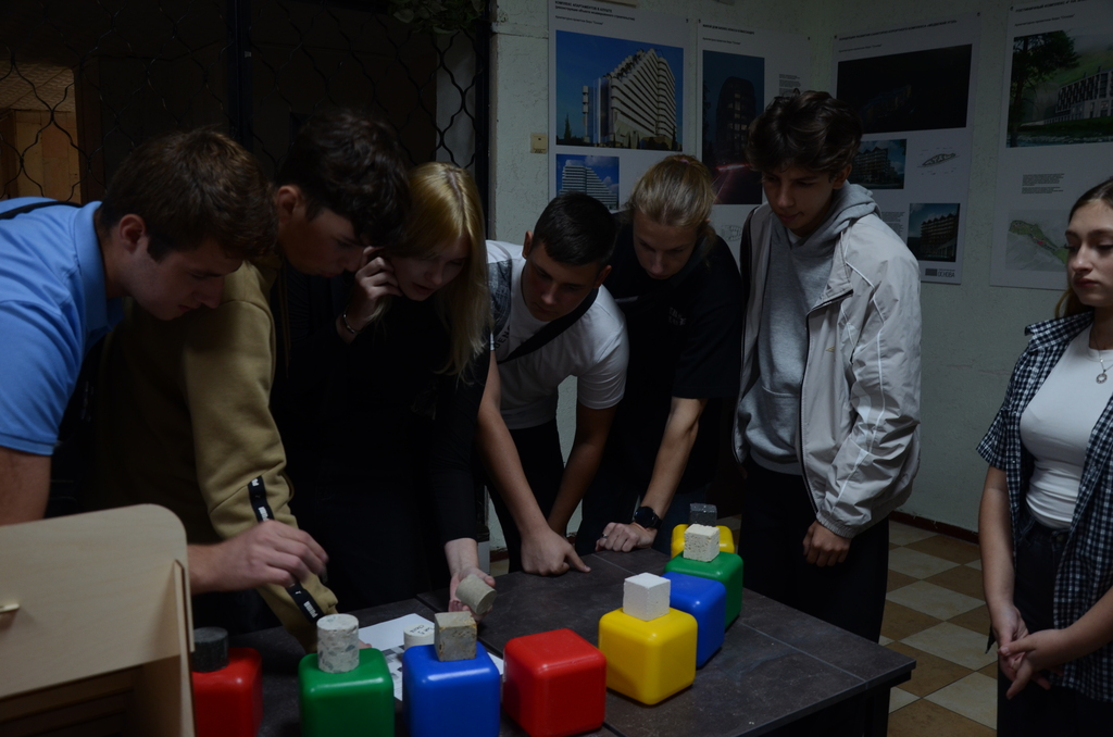 Также абитуриентам рассказывали про свойства различных материалов, они испытывали усилиями на изгиб образцы арматурных изделий. Абитуриентам показывали строительные материалы, которые используются для проектирования зданий и сооружений: арматуру стальную; арматуру стеклопластиковую; соединения сварные, механические и резьбовые; бетон; известняк; кирпич. Было интересно и познавательно! В ходе выполнения заданий игры, команды набирали баллы.